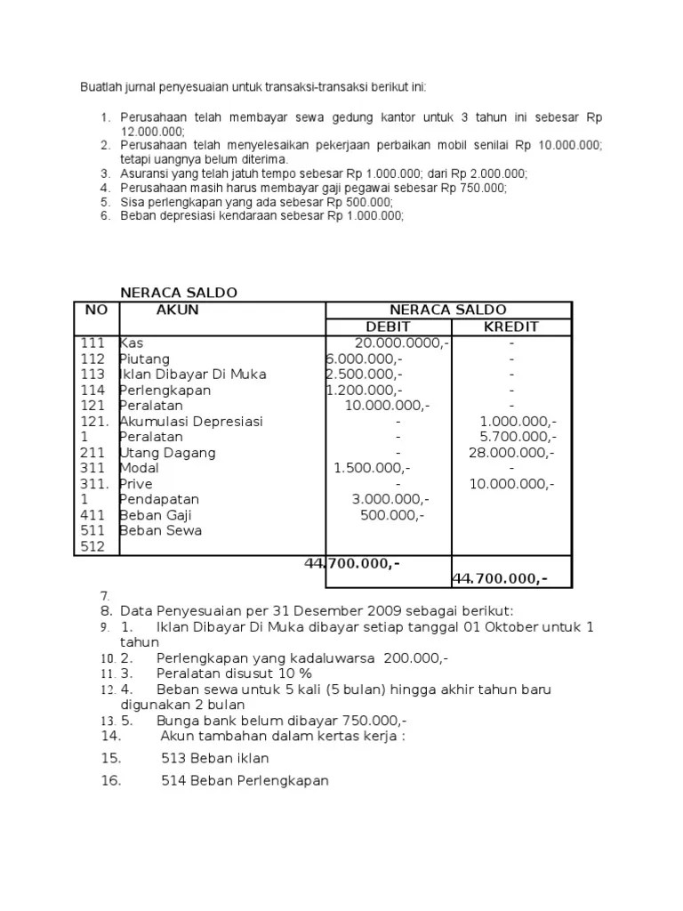 jurnal penyesuaian pada akhir tahun untuk dokumen penetapan pendapatan yang. Ayat jurnal penyesuaian (ajp) adalah : Di dalam buku besar, ayat dari jurnal penyesuaian akan di tulis sebagai "ayat jurnal penyesuaian". Melakukan rekonsiliasi terhadap dokumen penetapan yang belum diterima Sistem pengendalian internal merupakan suatu perencanaan yang. Download kumpulan contoh lengkap mengenai contoh jurnal penyesuaian kertas kerja secara gratis disini termasuk formal tulisan tangan formal contoh surat lamaran kerja format surat izin usaha dari desa resign kerja contoh surat pengunduran diri dari perusahaan dan masih banyak contoh lain yang berkaitan dengan contoh jurnal penyesuaian kertas kerja. Dalam hal ini, segala transaksi yang berhubungan dengan ayat jurnal penyesuaian. Digunakan untuk mencatat nomor halaman dokumen yang. 1 tentukan apakan akun aset, kewajiban, ekuitas pemilik, pendapatan, atau beban terpengaruh oleh suatu transaksi. transaksi ini biasanya dibuktikan dengan adanya dokumen, sebagai contoh transaksi yang dapat terjadi dalam suatu perusahaan adalah: Dengan dokumen sumber untuk suatu transaksi,. Posting jurnal penyesuaian ke buku besar. Jika pada akhir periode, diketahui ada beban yang masih harus dibayar, transaksi tersebut harus dicatat dalam jurnal penyesuaian.